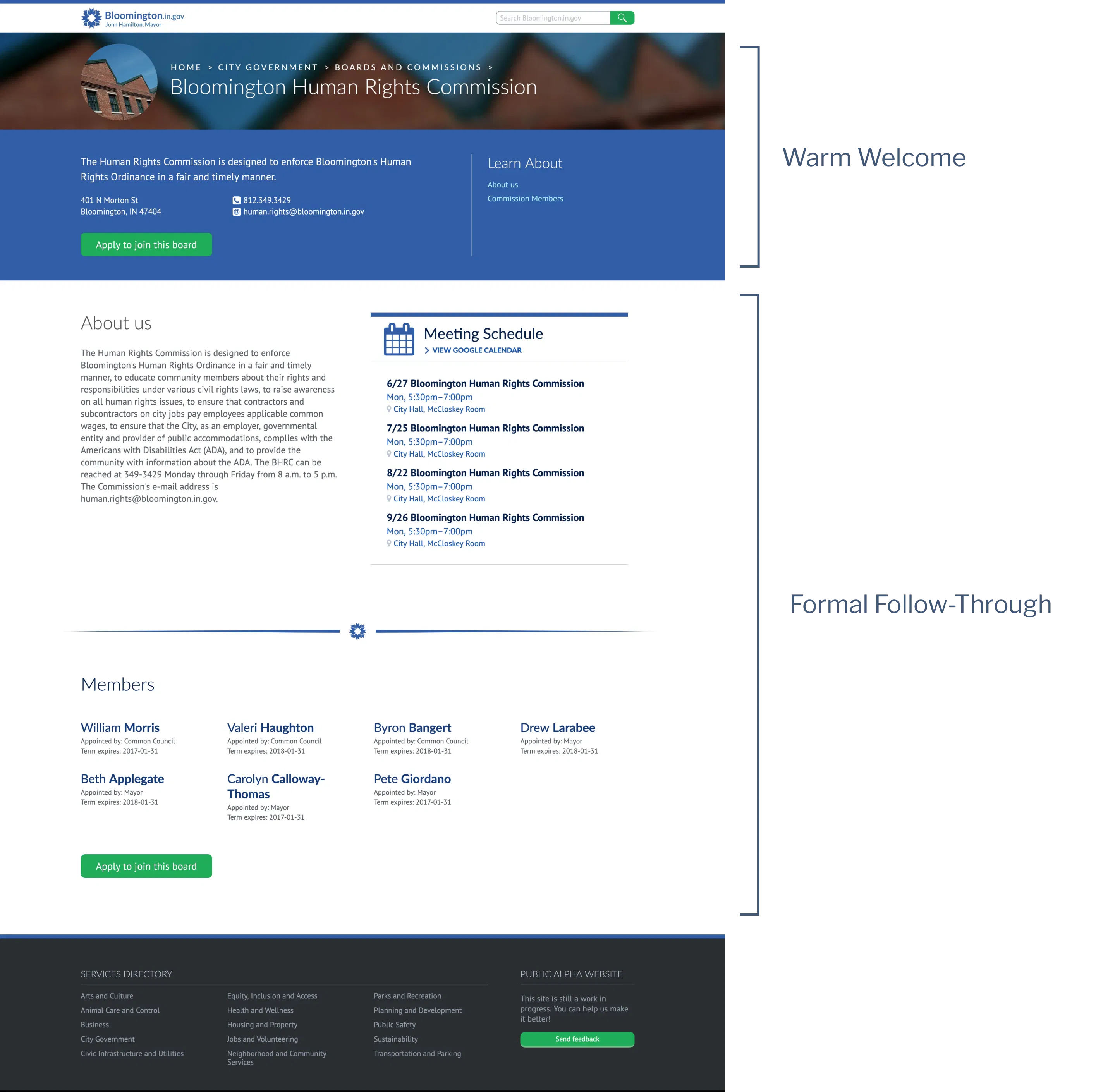 The warm welcome and a formal follow-through. The top of the page gives context to visitors just landing here from a search engine. As they scroll down, they can see how to take action.
